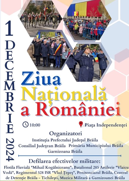 Instituția Prefectului – Județul Brăila, Primăria Municipiului Brăila și Consiliul Județean Brăila organizează manifestările dedicate Zilei Naționale a României care se vor desfășura duminică, 1 decembrie a.c., începând cu orele 10:00, în Piața Independenței din municipiu Brăila.