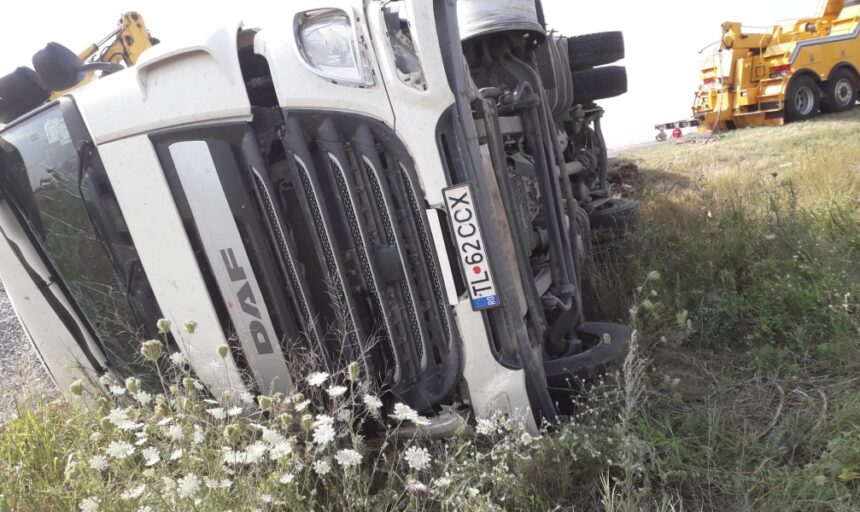 Un autocamion pentru transportul cerealelor, încărcat cu pietriș, s-a răsturnat, aproape de localitatea Albina. Circulația a fost blocată