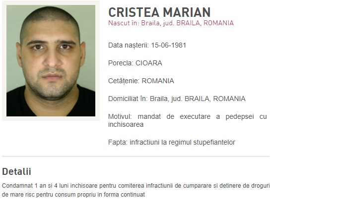 În cazul lui Marian Cristea, zis ”Cioară” (41 de ani), judecat și ulterior condamnat pentru deținere și consum de stupefiante în formă continuată, mandatul de urmărire a fost emis în iunie 2022, după ce a rămas definitivă pedeapsa de 1 an și 4 luni închisoare, tot la Curtea de Apel Galați. Era deja fugit din țară, la momentul condamnării!