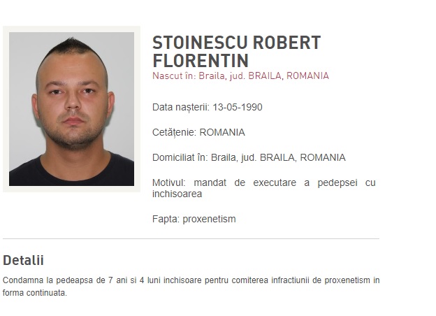 Singurul proxenet, din dosarul de trafic de persoane, care a reușit să fugă înainte de pronunțarea sentinței definitive, este Stoinescu Robert Florentin (33 de ani). Acesta a fost condamnat la 7 ani și 4 luni închisoare pentru proxenetism în formă continuată și a fost dat în urmărire la nivel european, după condamnarea în noiembrie 2022.