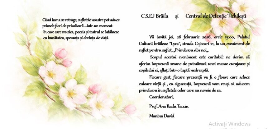 Joi, 26 februarie a.c., la Palatul Culturii Brăilene ”Lyra”, strada Cojocari 21, începând cu ora 15:00, va avea loc spectacolul caritabil ”Primăvara din noi…e iubire”, pus în scenă de tinerii aflați în Centrul de Detenție Tichilești.
