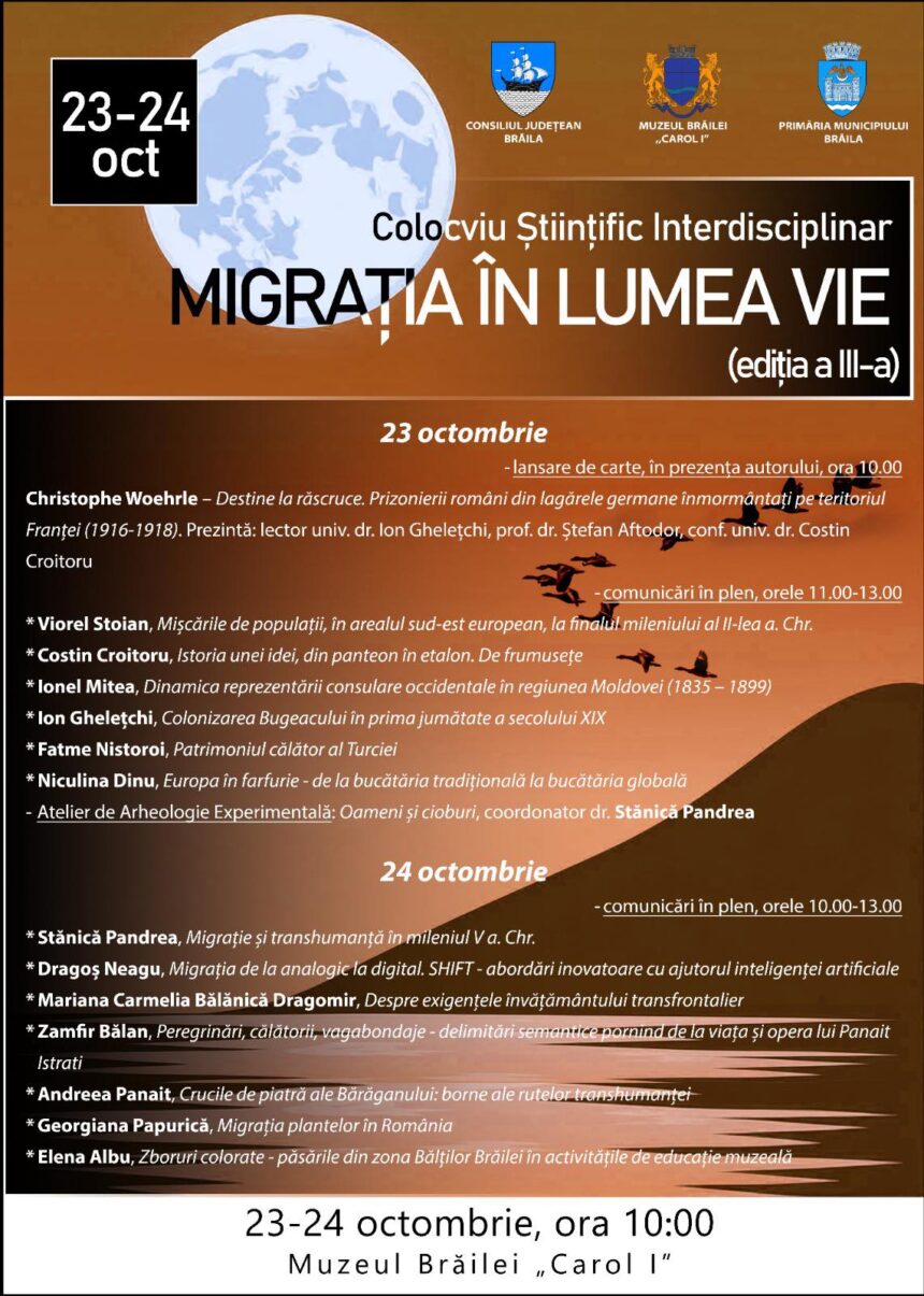 În zilele de 23 și 24 octombrie a.c., Muzeul Brăilei „Carol I” organizează, la sediul din Piața Traian nr.3 – sala ”Regele Ferdinand și Regina Maria”, a III-a ediție a Colocviului Științific Interdisciplinar „Migrația în lumea vie”.
