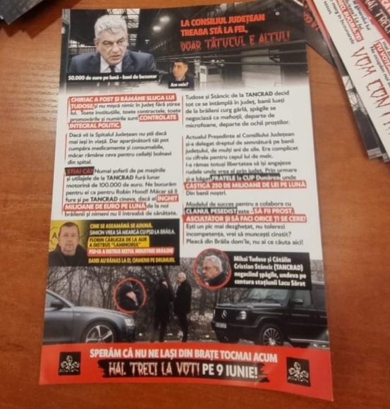 ”La data de 6 iunie a.c., în jurul orei 23:45, polițiști din cadrul Poliției Municipiului Brăila – Biroul Ordine Publică în timp ce se aflau în exercitarea atribuțiilor de serviciu au observat un grup de persoane motiv pentru care au procedat la interceptarea și legitimarea acestora. Cele 11 persoane au fost identificate de polițiști, având asupra lor mai multe afișe electorale. La ora 00:25, polițiștii au fost sesizați prin apel 112 cu privire la faptul că există un conflict între mai multe persoane pe Calea Călărașilor. Din primele date, a reieșit că un tânăr de 28 de ani, în timp ce distribuia materiale electorale a reclamat că ar fi fost amenințat cu acte de violență de un bărbat de 48 de ani, din Brăila, ce făcea parte dintr-un grup de cinci persoane, motiv pentru care ar fi fugit, escaladând un gard și creând distrugeri unui autovehicul parcat. Persoanele implicate au fost invitate la sediul poliției pentru clarificarea situației. În cauză continuă cercetările într-un dosar penal întocmit sub aspectul săvârșirii infracțiunilor de amenințare și distrugere, informându-se totodată Autoritatea Electorală Permanentă în conformitate cu prevederile legale”.