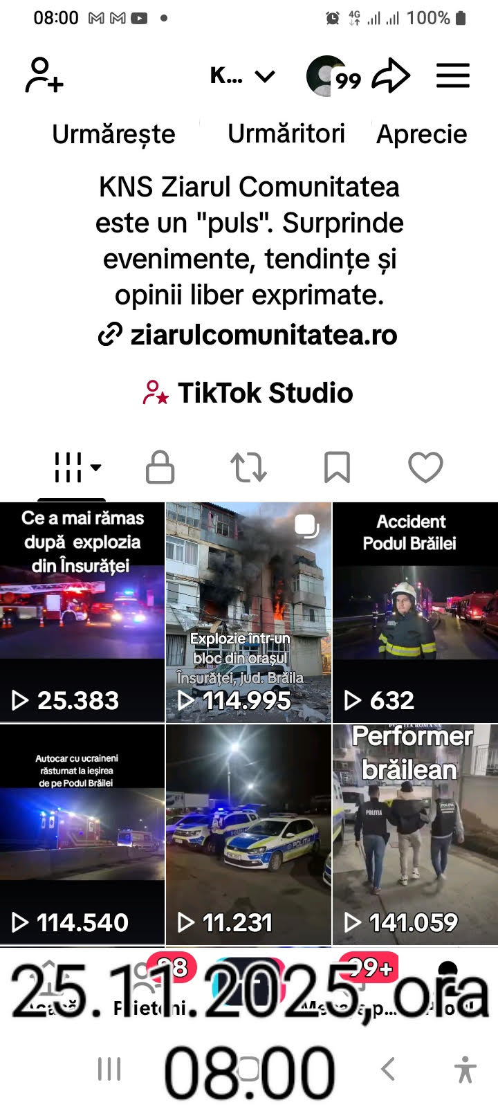 Până astăzi, 25 noiembrie, la ora 08.00, contul de TikTok al Ziarului Comunitatea (KNS Ziarul Comunitatea) a adunat peste 250.000 de vizualizări la postările despre accidentul turiștilor ucraineni și explozia urmată de incendiu de la Însurăței, semn că acestea sunt teme sensibile, în această perioadă.