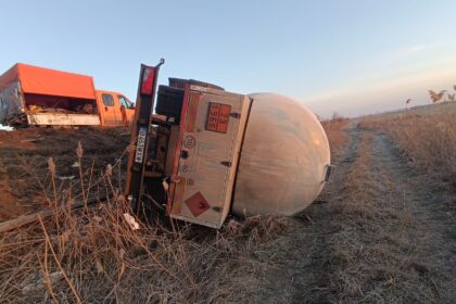 Cisternă răsturnată la Vădeni. Șoferul ar fi adormit la volan, potrivit martorilor